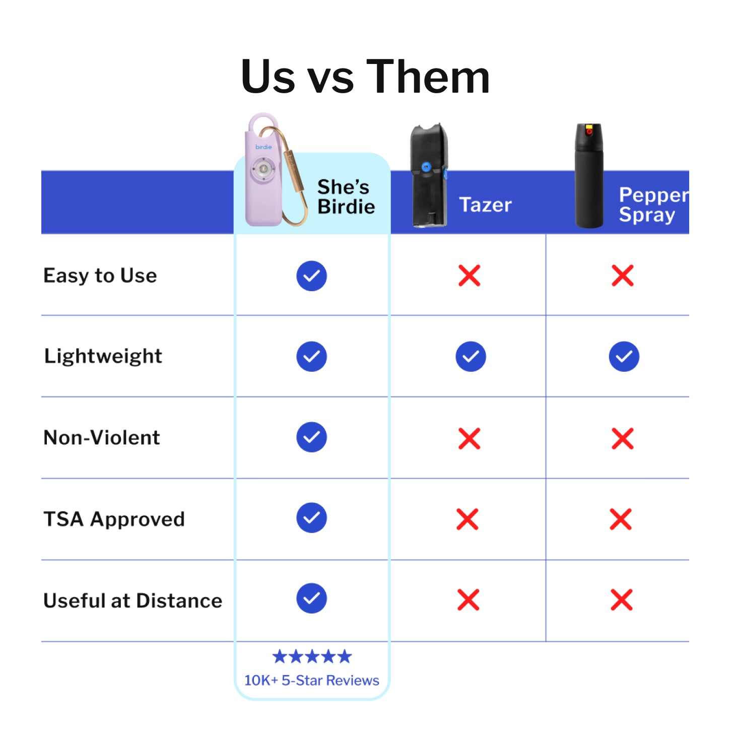 Birdie takes the lead when stacked against other self-defense tools, offering ease of use, a non-violent approach, and more.