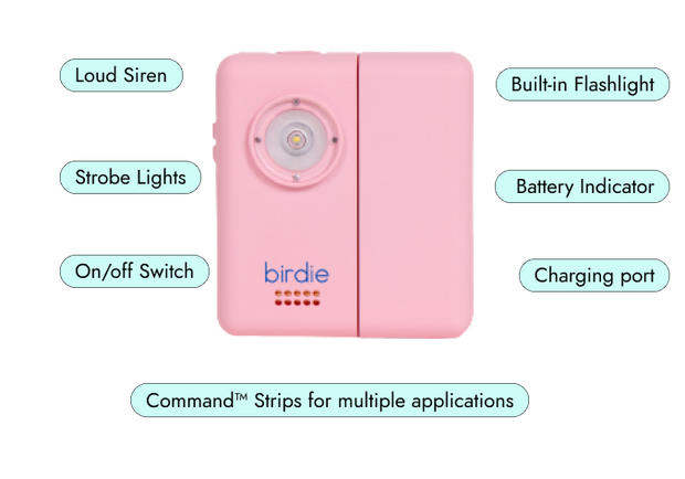 Birdie Box is simple to set up and use. Attach it to any door using the included Command™ Strips, ensuring the box is positioned within 1/2 inch of the door frame, with both the frame and door no more than 1/2 inch apart. When the door opens, the alarm activates, emitting a loud siren and flashing strobe light to deter intruders and alert you to potential danger.